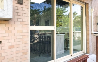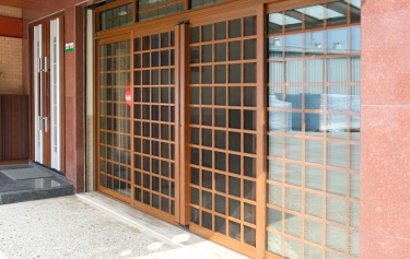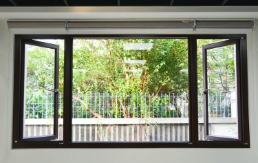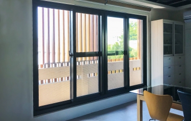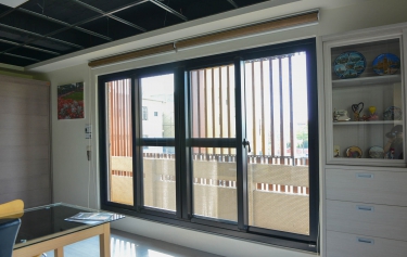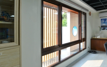 木紋裝潢辦工室配上木紋鋁板大門,位於一樓大門除去鐵捲門後前段使用4拉橫拉落地窗,當落地窗關上時立刻分隔出室內外空間,打開時窗扇可收單邊設計進出方便,配合平軌式軌道讓人出入安心,不再怕被突起的軌道阻礙絆倒。