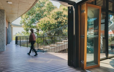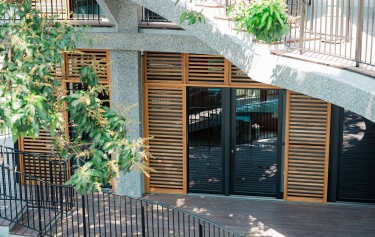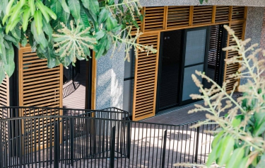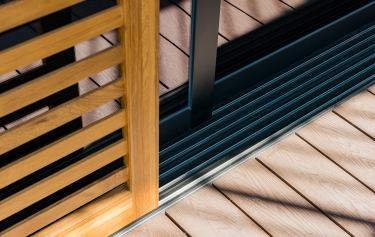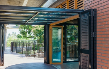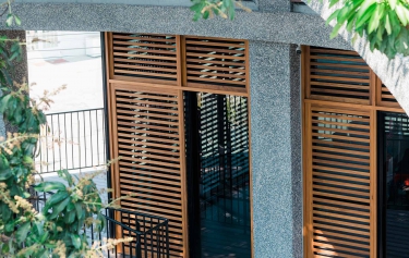 辦公建築基地所有的門窗皆使用全天候的平階無障礙落地窗系統,每一扇門窗框體與不鏽鋼軌道採用低調沈穩的黑色系,結合訂製原木格柵,能遮擋陽光日曬且在門窗自由移動間調節光線,如此高度客製化規格,成就獨一無二的創新設計。