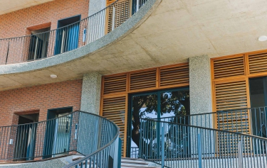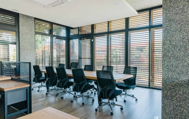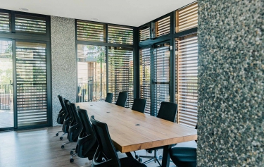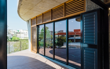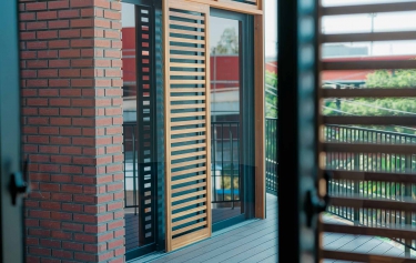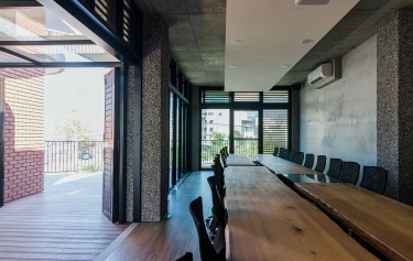 辦公建築基地一開始尋找鋁門窗合作廠商,一波三折,許多國內知名廠商經研討後也無法達到建築設計要求,但緣分會把理念相同的一群人聚在一起,全天候與合作夥伴宗益行,秉持「永續、自然、節能」的企業宗旨,設計始終站在客戶角度考慮,深刻探討使用者的確實需求,過程中接受挑戰,一直推敲琢磨,所幸不負所托。 此案的平階落地窗設計,門窗與木格柵結合的創新設計,獨一無二,集工法之大成,美觀與功能併進,結合建築師空間設計中的風場導向、氣流方向,安排風從哪裡進氣,且排氣減熱,讓辦公環境非常舒適!