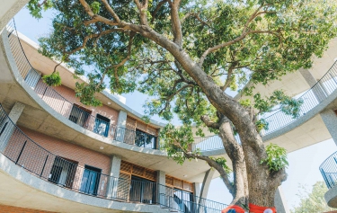 百年芒果樹建築基地,讓營造公司同仁在自然和諧的環境中工作與生活,就像小時候與鄰居在欖仁樹下、榕樹下生活般,一起互助合作忙農事、用餐、休憩乘涼開講。