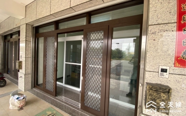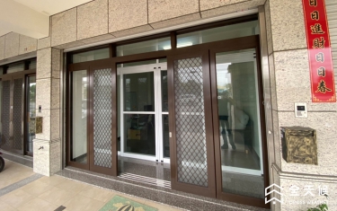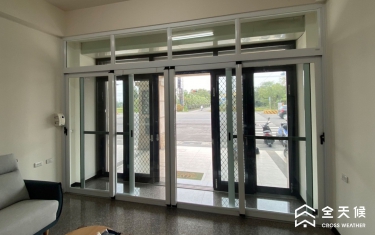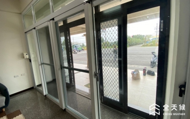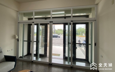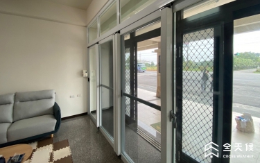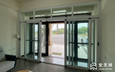 大門口原為上方有鐵捲門的一般落地窗,噪音通常會從上方空間竄進室內,商討之後,採納全天候規劃師的建議,在室內施作另一樘無障礙的落地窗,變成雙層窗,阻擋對外噪音,還因此區隔出一個像玄關的空間,可以放置物品以及當成進屋的落塵空間。