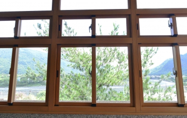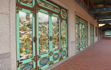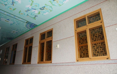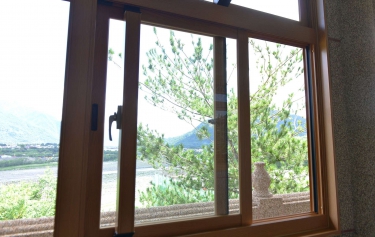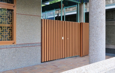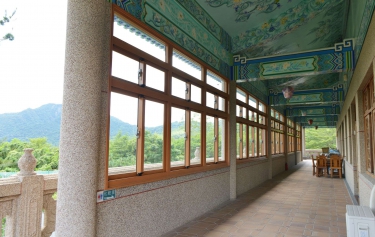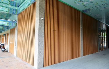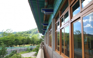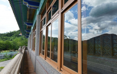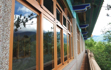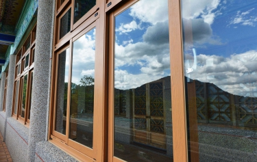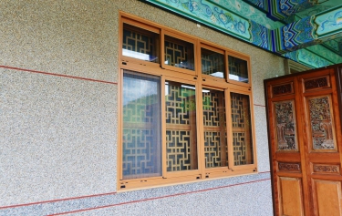 位於山上難免風大雨大,寺廟二側使用全天候防颱窗,第一線阻擋風雨入侵,其次形成防雨之室外空間。同時並使用仿木紋顏色,程度逼真與原木相近,與寺廟風格一致更顯特色。