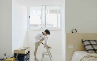 孩子們的房間僅能容納家具延伸出的作息,睡覺、寫作業之外就只有一條窄道,想做什麼事的習慣是通往客廳,「所以大家都很自然窩在客廳一角,女兒畫畫、兒子煮菜⋯⋯,你看他的籃框也掛這,他最近還在這裡做木工,完成了一個以菜刀為模型的桌球拍。」