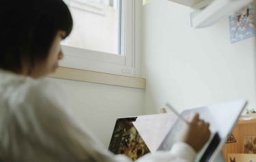 正在留學的大女兒,未完成的作品留在家中讓家人們接力,賴馬曉妍的創作,也常常是和孩子們一起想梗,客廳像是家庭版的co-working space,拓寬了家人定義的可能性。