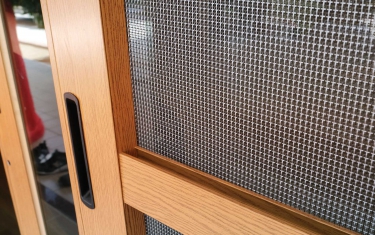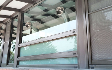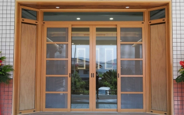 全天候無障礙橫拉門窗,平軌式設計方便進出不絆倒,使室內外空間交融;同時特殊轉角讓窗型展現U型空間,以後兩側放置特殊門神玻璃,更顯門將威風。配上同內框紗網門,讓蚊蟲無法進入又依然通風,自然風循環室內空氣不悶熱。