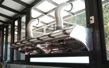 排油煙機的部份則是特別處理,讓排煙口直接穿過玻璃,使整邊可保有一致設計。而機器下方的玻璃採用白玻璃,以後油煙痕跡外面看不見,外部保持乾淨整潔。